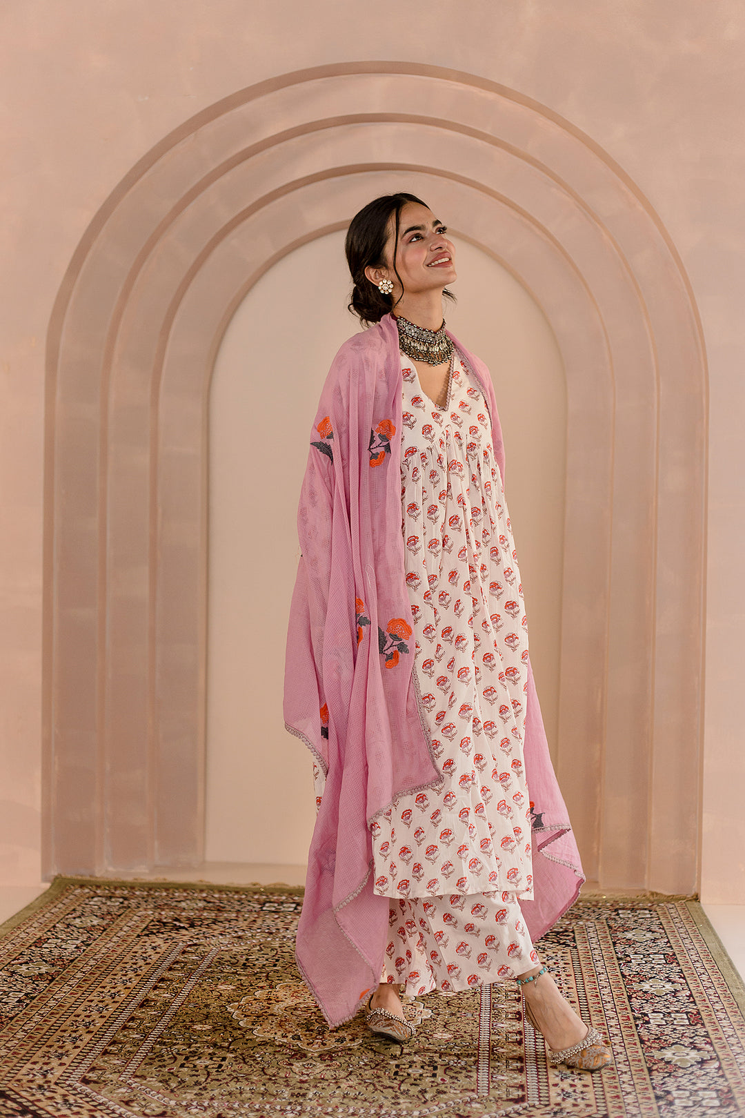 The graceful and twirl-worthy Anarkali suits are a style statement that transcends generations. An Anarkali suit set comprises a flowing kalidar kurti paired with pants, palazzo, or churidar, along with a coordinating dupatta. Gulabo Jaipur presents a premium collection of Anarkali suits, featuring a variety of designs.