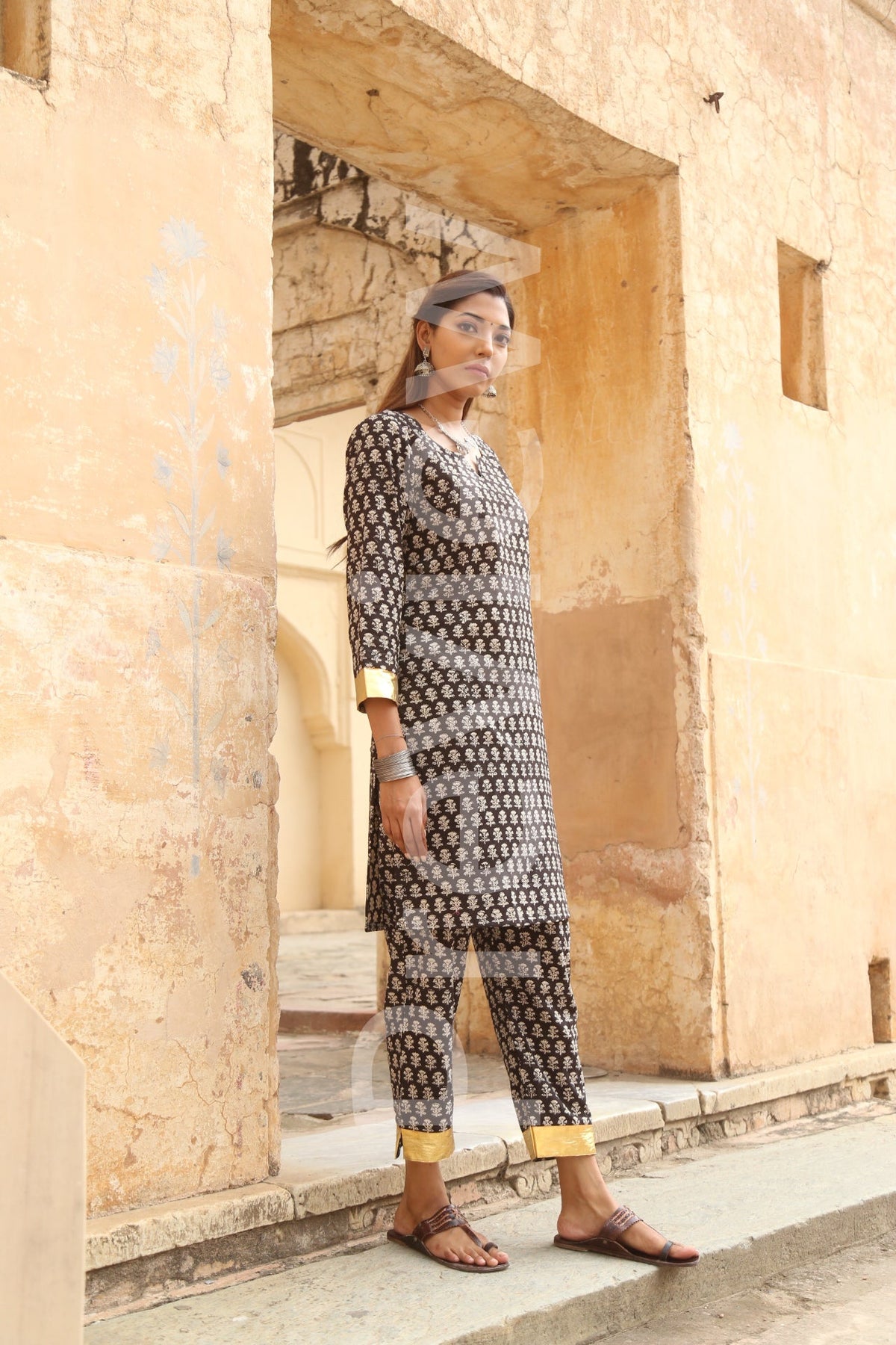 ??¨Pick the gorgeous anarkali and feel festive without compromising with your comfort. Block printed anarkalis in soothing colors, paired with off white cotton chikan pants and matching dupatta with golden lappa detailing.