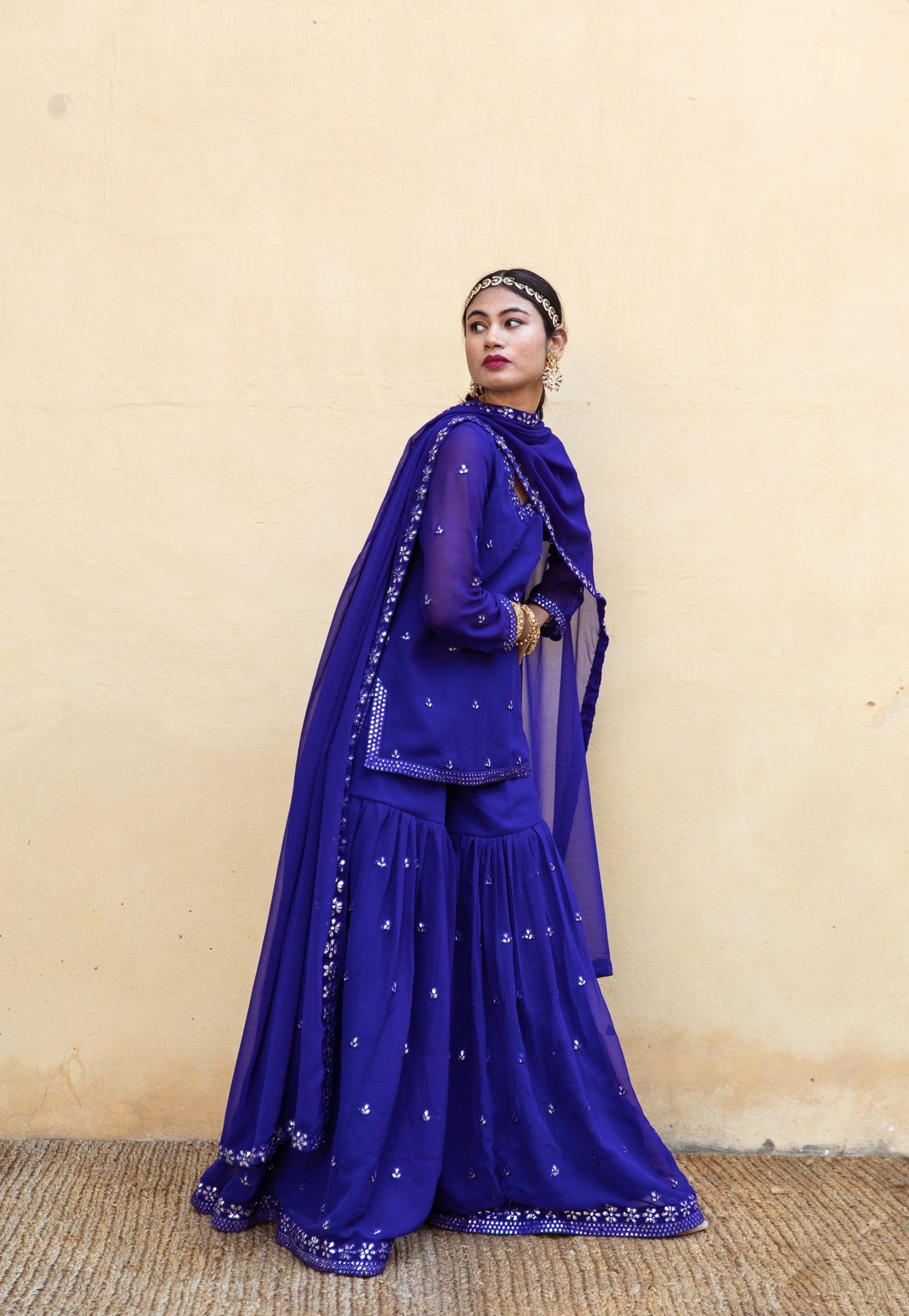 This exclusive Sharara Set is made in georgette fabric in vibrant colors and beautiful mirror embroidery details, paired with same fabric dupatta and sharara.