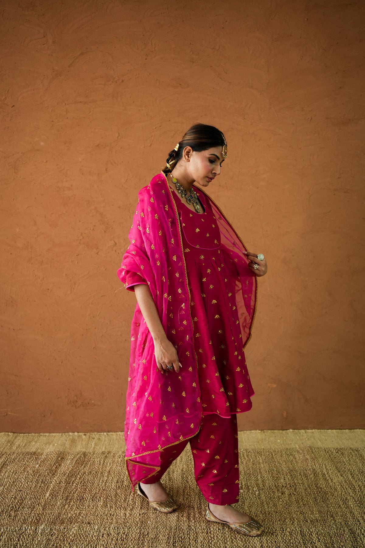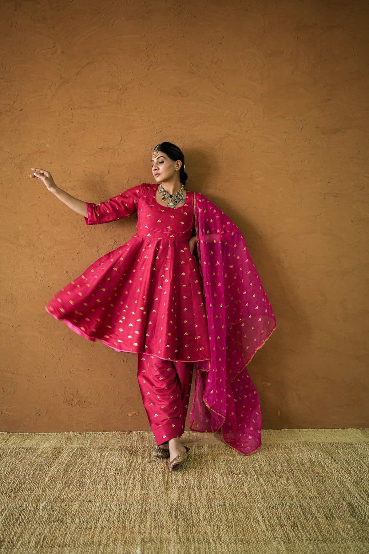 Grace meets tradition in this elegant Chanderi Anarkali, beautifully adorned with delicate hand-worked butta all over the silhouette. The luxurious flow of the fabric adds a regal charm, while the intricate detailing enhances its timeless appeal. Paired with a matching dupatta, finished with a subtle yet striking golden lace border, this ensemble perfectly blends sophistication and tradition. An ideal choice for festive occasions, weddings, and celebrations where you want to make a statement with understated elegance.