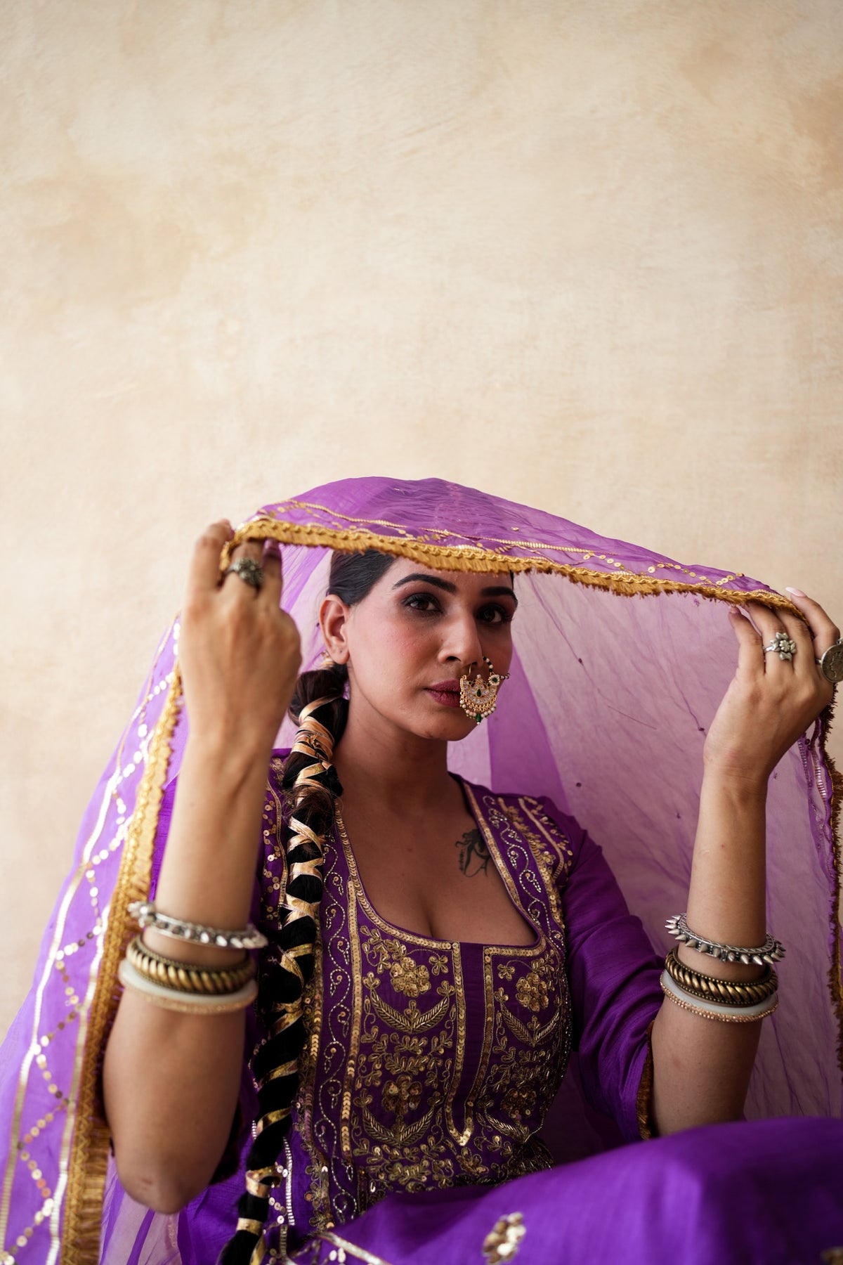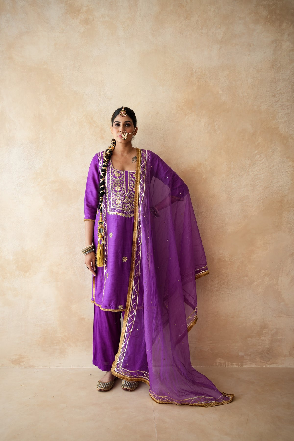 Crafted on a luxurious base of vibrant Purple fabric, this three-piece set includes a straight kurta adorned with intricate zardozi-inspired threadwork, delicate sequins, and mirror embellishments—each stitch placed with precision by skilled artisans. The ensemble is completed with a matching Pants and a lightweight organza dupatta, finished with a gold scalloped border and subtle shimmer accents for a regal touch.