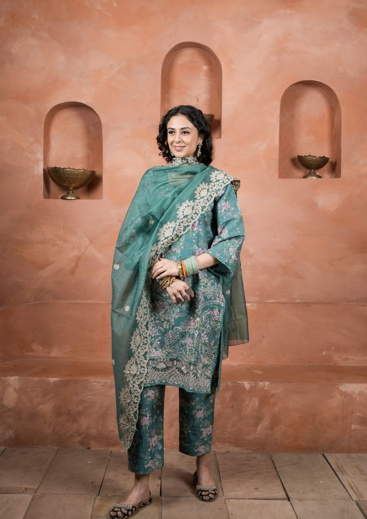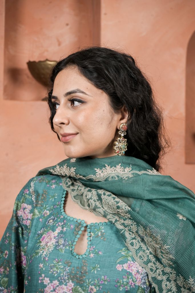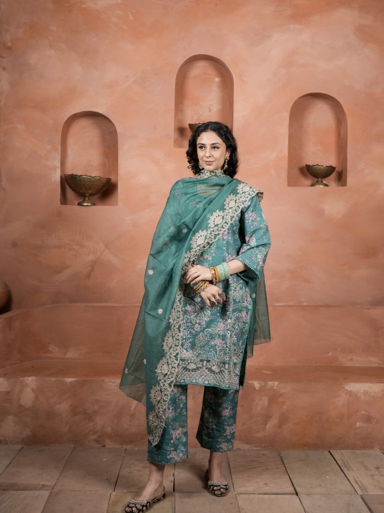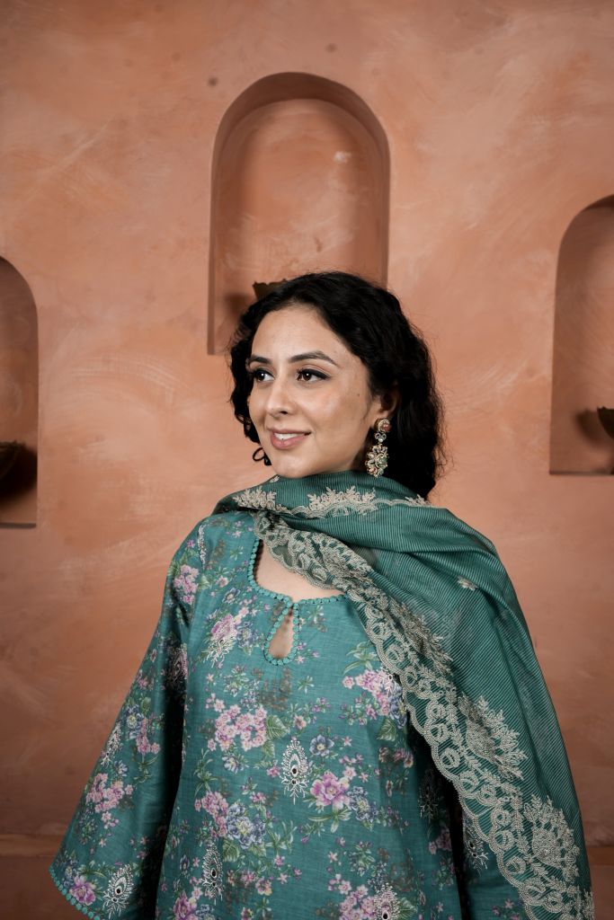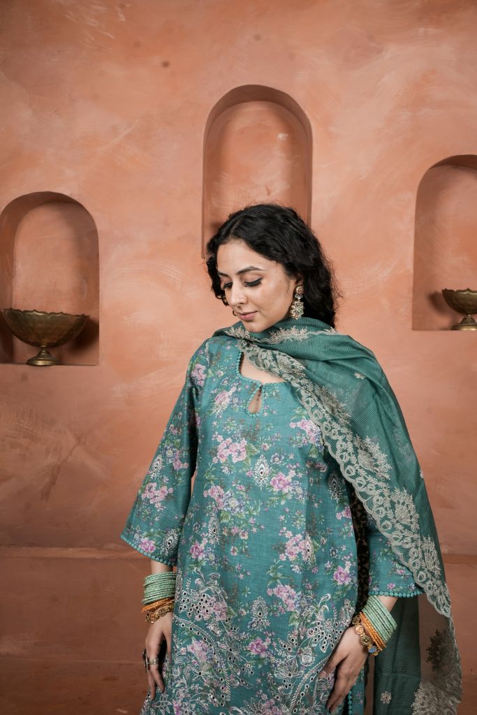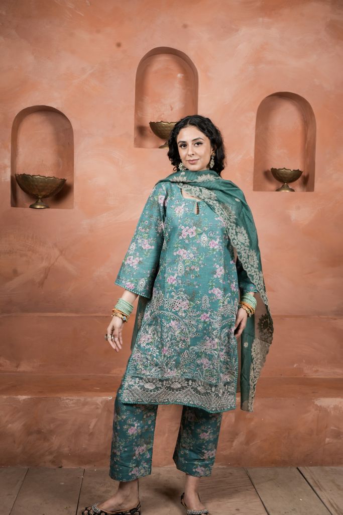 The rich color palette and intricate floral motifs add a refined charm, making it ideal for festive gatherings, intimate celebrations, or elegant daywear. Designed in a breathable fabric with a flattering silhouette, this set ensures ease of movement while maintaining a polished look.