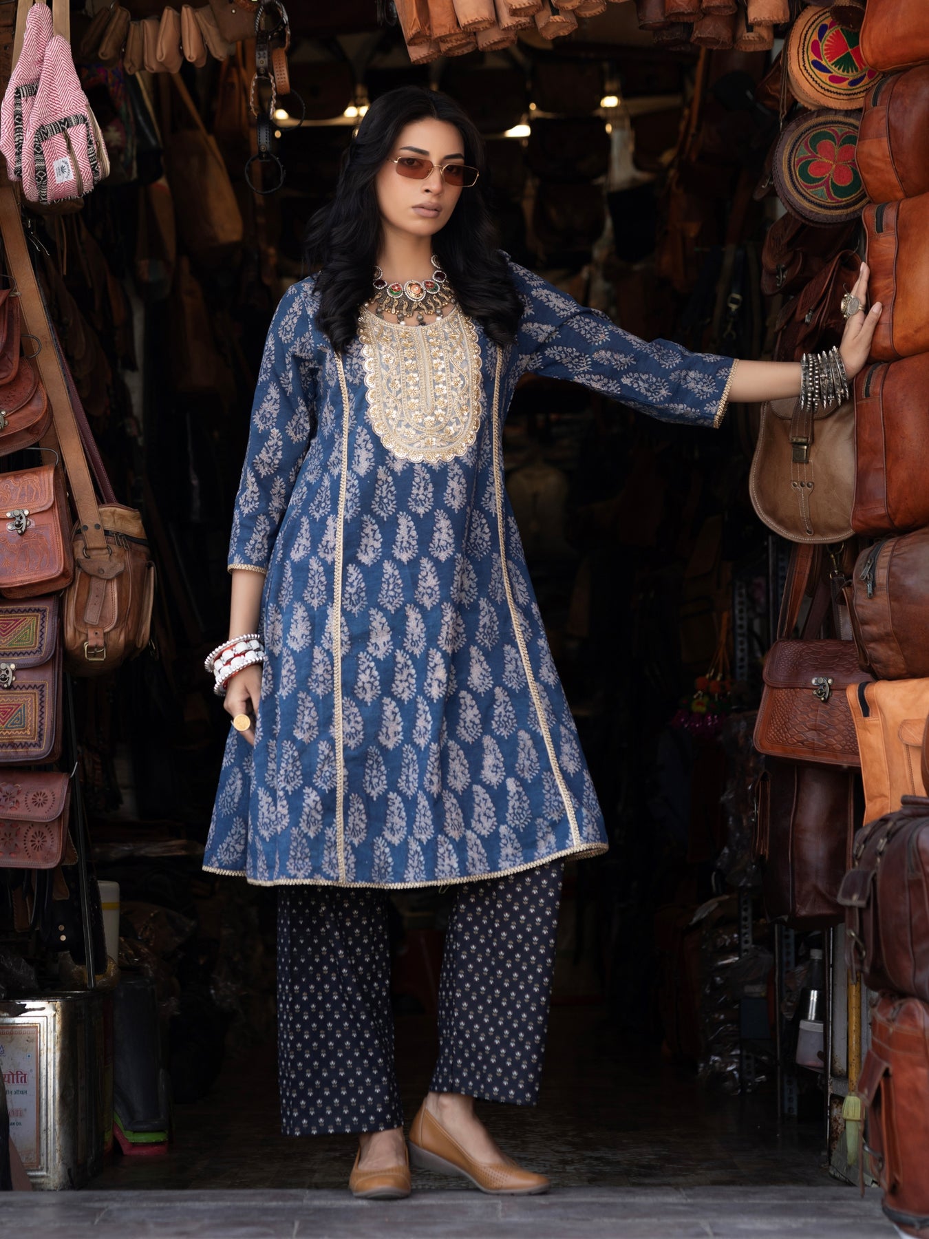 A refined take on classic block-print aesthetics, this indigo kurta is a statement in effortless elegance. Crafted in a rich blue base, it features delicate ivory motifs arranged in a rhythmic pattern, lending it a timeless, handcrafted appeal. The highlight lies in its intricately embroidered yoke, where fine detailing meets a soft, scalloped finish—adding depth and a touch of vintage charm. Subtle contrast piping along the panels enhances the structure, giving the silhouette a flattering, tailored edge.