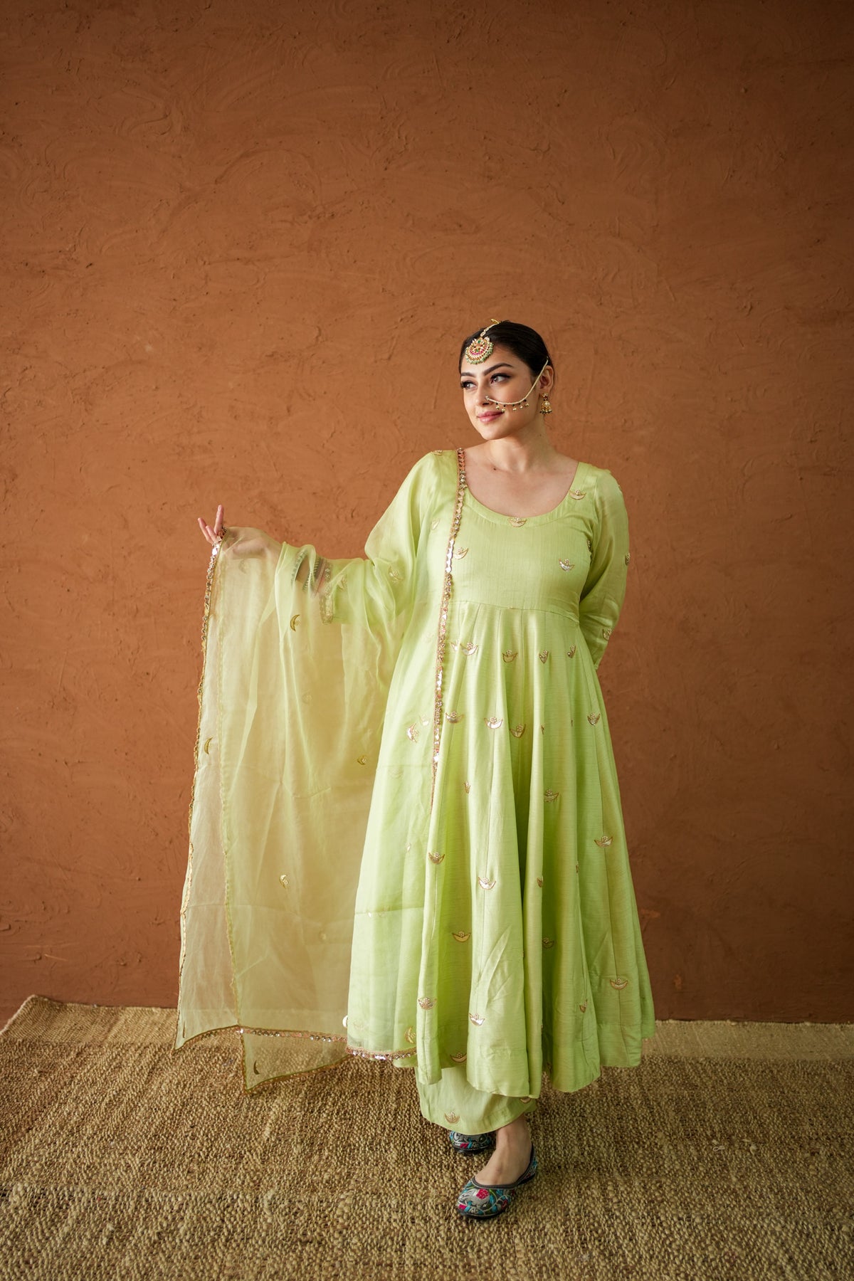 •Beautifully hand crafted, Chanderi Anarkali set with taari work finished with lace.