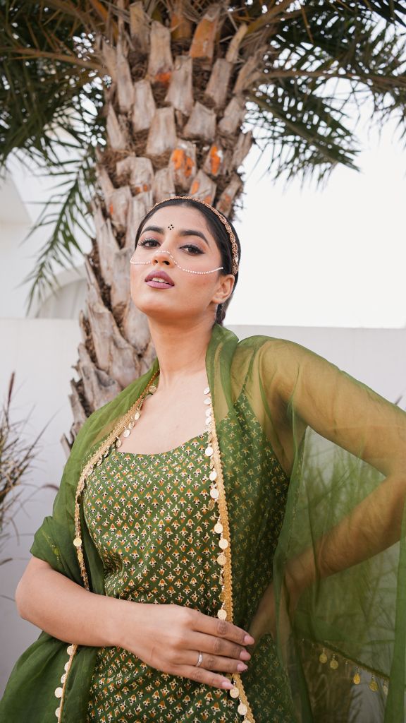 •Paired with cotton pants and matching dupatta. It has lovely hand work, lace detailing on dupatta, finished with full length inner.