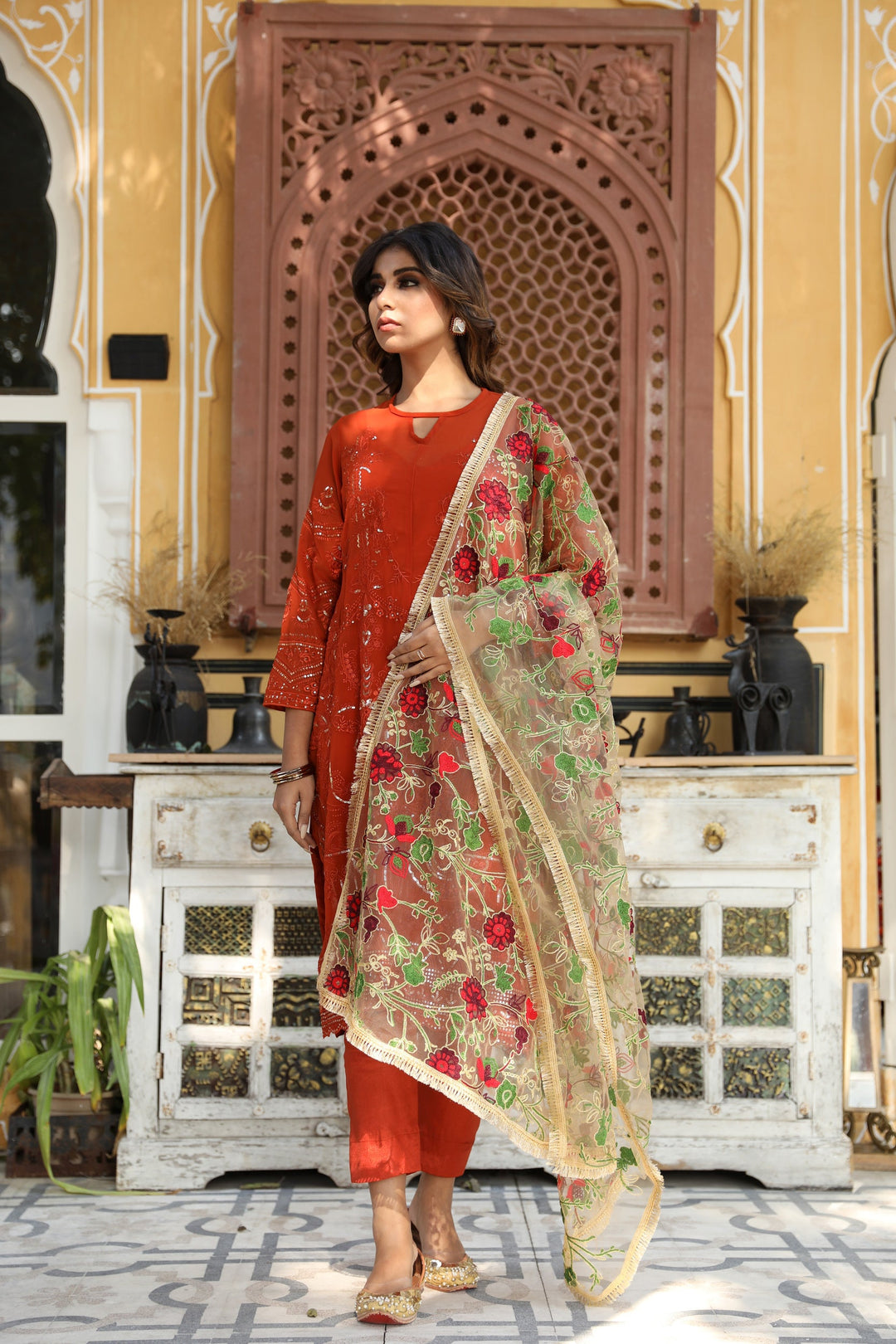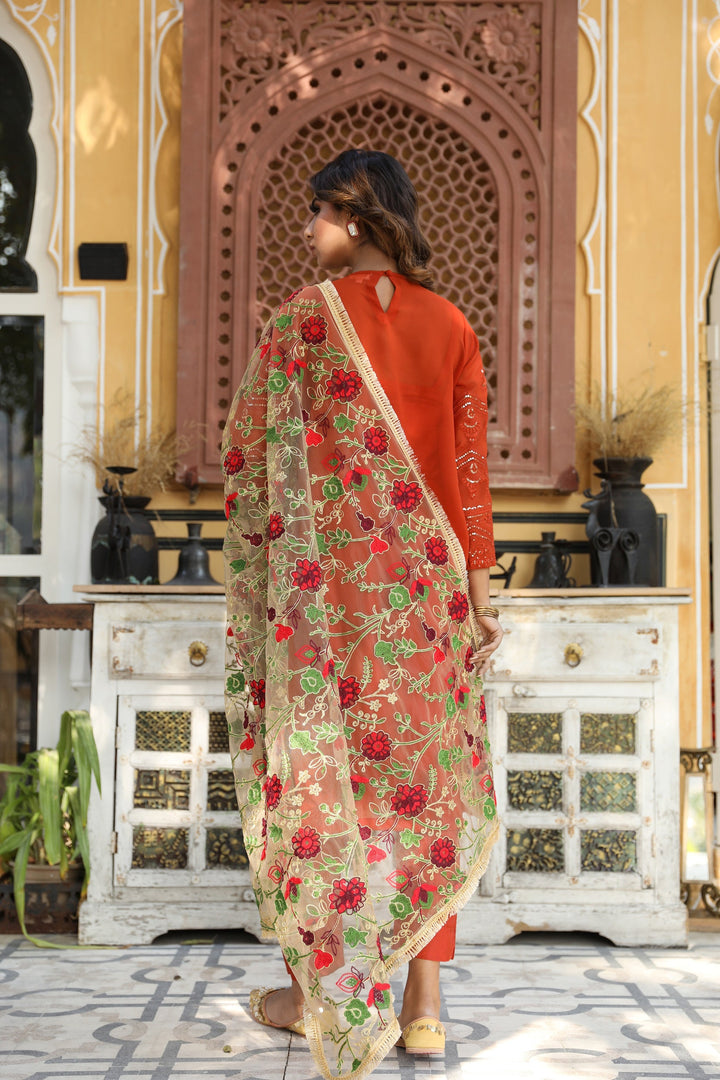 Georgette Gulnaz Burnt Orange Straight Kurta Set With Dupatta