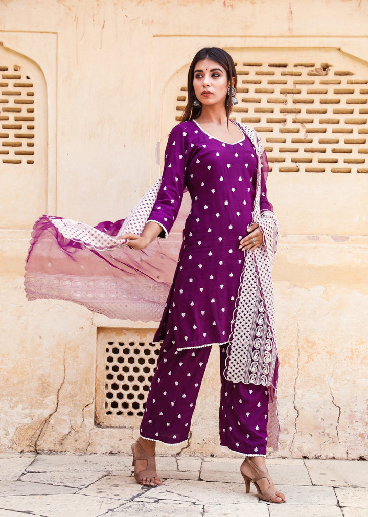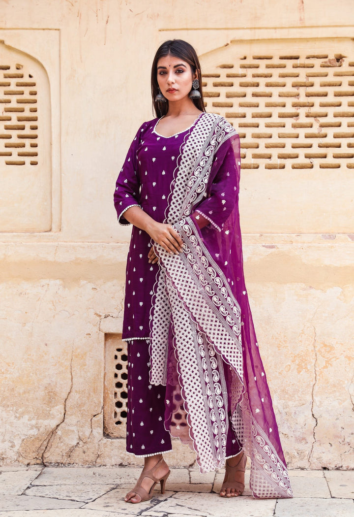 Fabric Details- Pure Cotton Modal Straight kurta with beautiful embroidery of fine motifs with same fabric pants adding elegance with Heavy Embroidered Organza Dupatta.