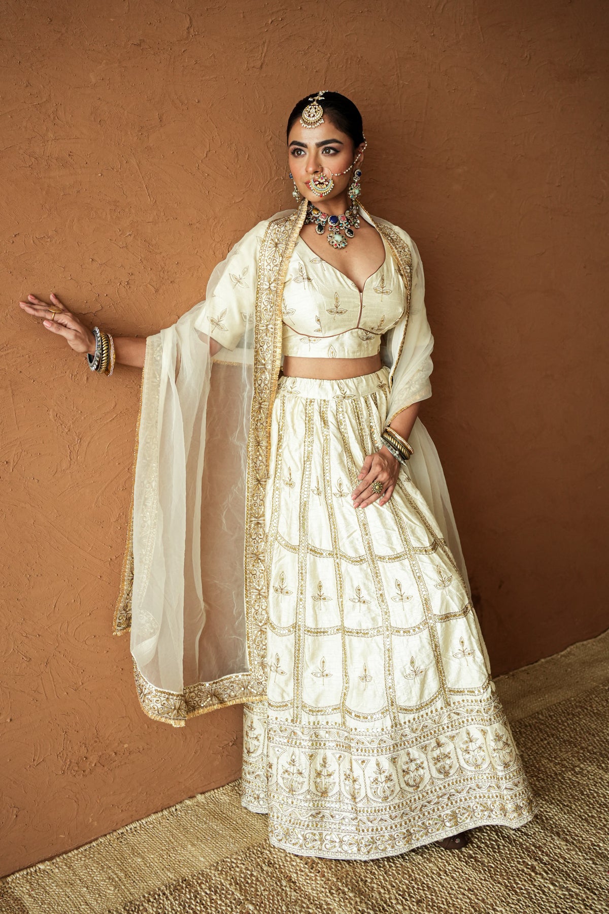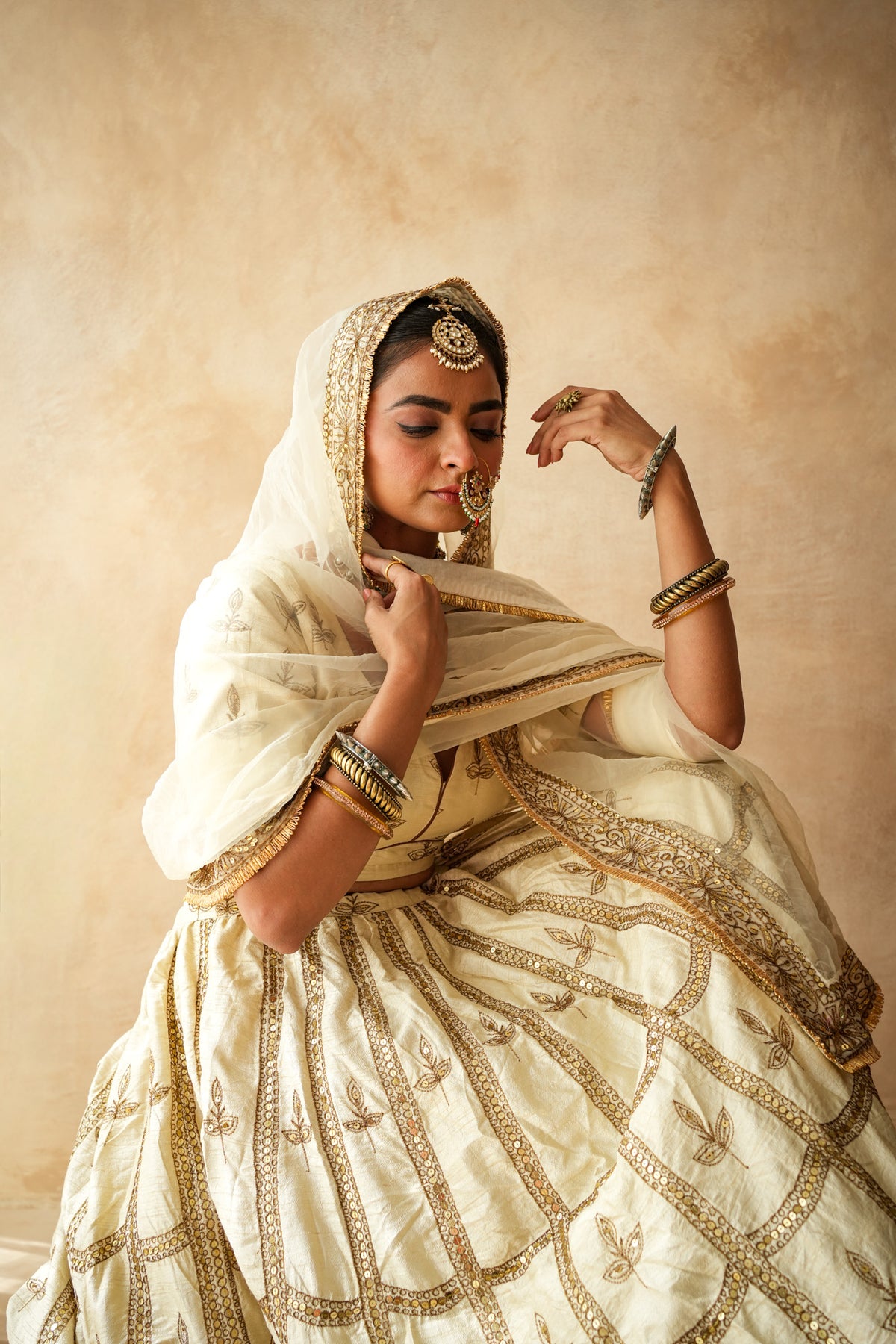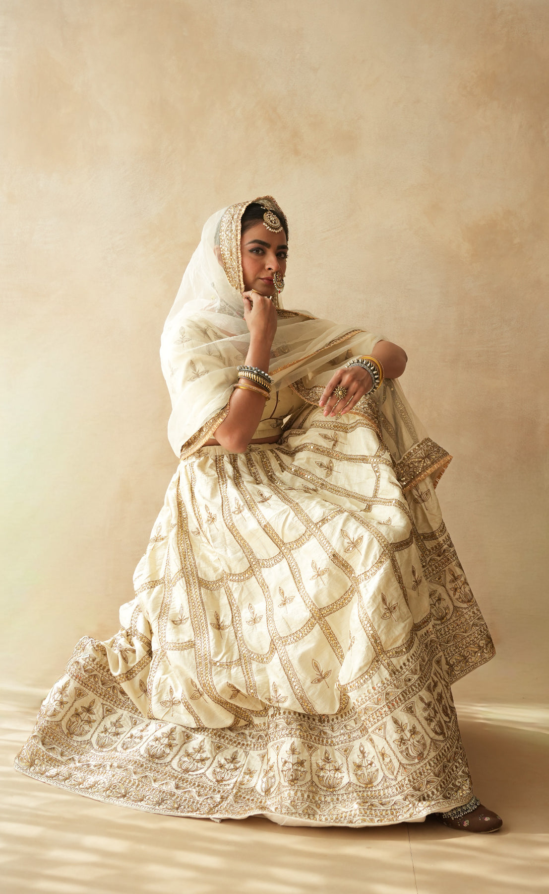 The voluminous lehenga flows beautifully with every step, crafted in luxurious fabric that holds structure while offering graceful movement. The coordinated dupatta, with embroidered borders and light scatter embellishments, completes the ensemble with understated charm.