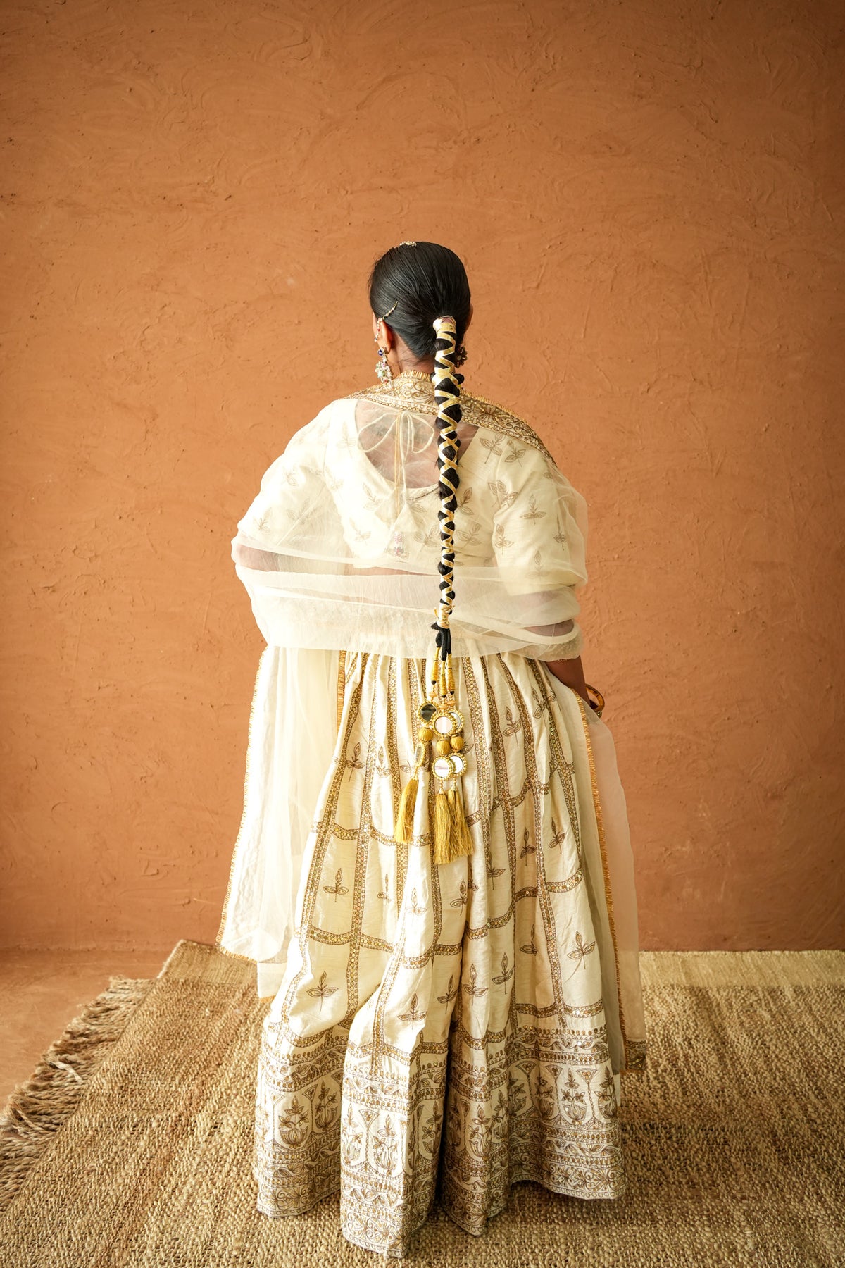 "Step into a world of regal grace with our Blossom Handcrafted Lehenga Set, where tradition meets timeless elegance. Rendered in a rich amber hue, this lehenga is a celebration of heritage craftsmanship and modern sophistication.