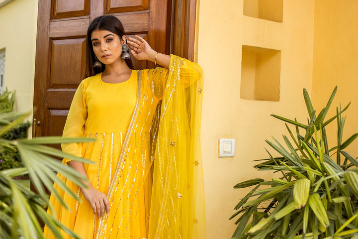 Resham Yellow Georgette Anarkali Set With Dupatta